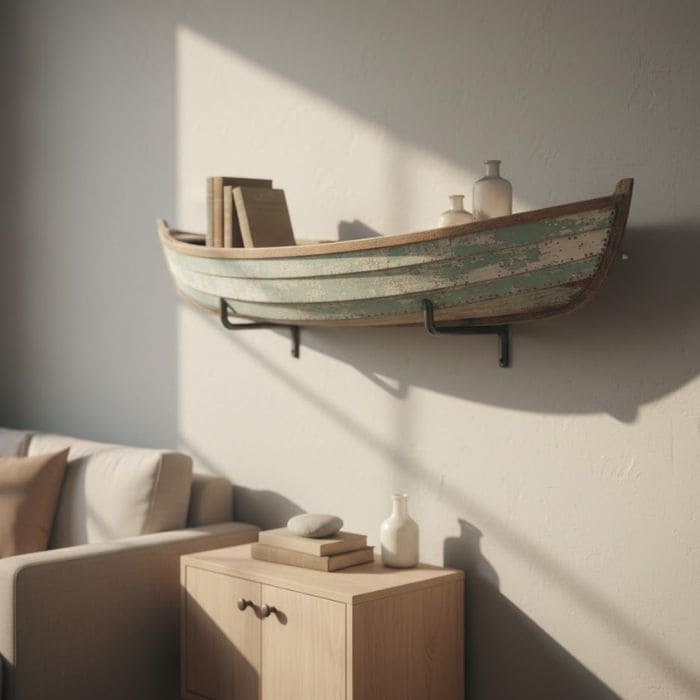 I could see the boat mounted on a wall, floating horizontally like a shelf, holding small books, a candle, a tiny plant, and maybe one piece of sea glass catching light.