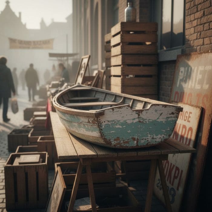 Near the back of the market, tucked between stacked wooden crates and a few rusted metal signs, I saw a small old wooden boat sitting low on a table.