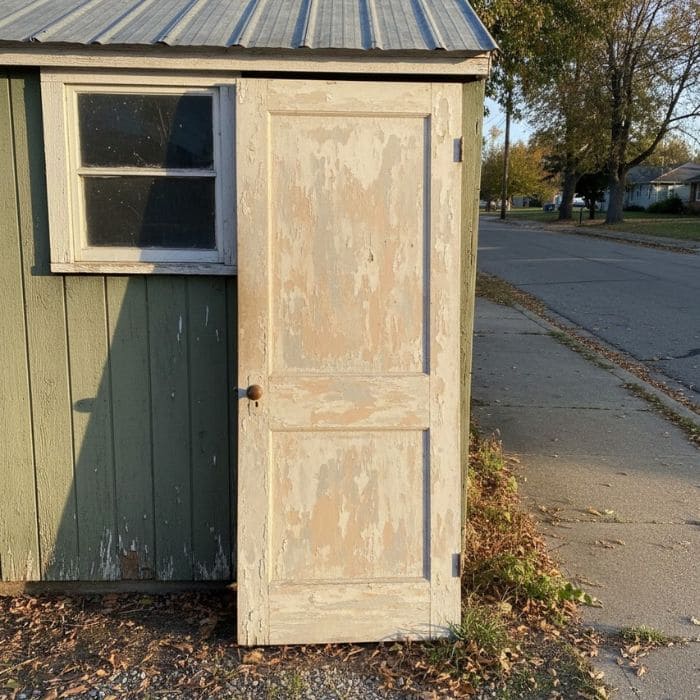 One afternoon, not far from my place, I noticed an old wooden door leaning against a small shed near the curb, positioned in a way that made it look abandoned but not unwanted, as if it had simply been set aside and forgotten.