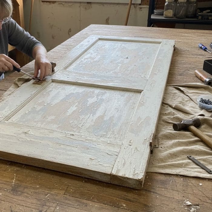 I avoided sanding the center panels heavily, because the marks and unevenness were part of the door’s story.