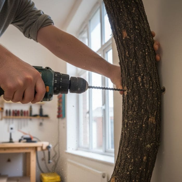 I drilled pilot holes through the branch first, choosing spots that would be hidden behind the curve of the wood. Then I held the branch in place and drove long screws through into the studs, tightening gradually instead of forcing them all at once.
