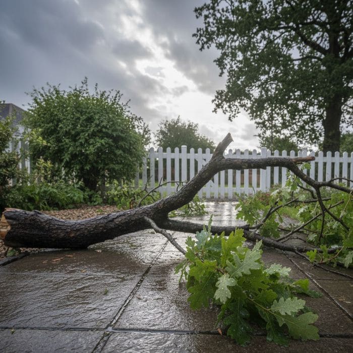Lying across the front path was a large oak branch, freshly fallen, still carrying a few leaves that glistened with leftover rain.