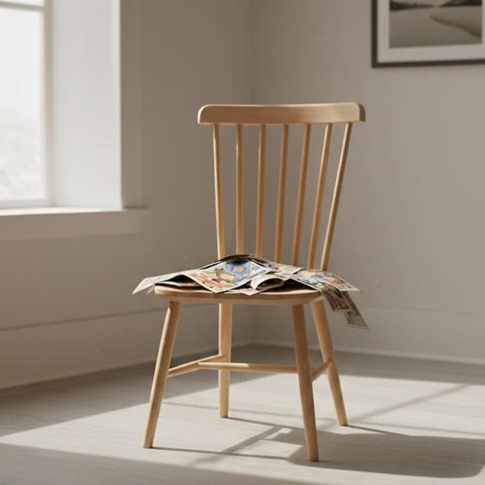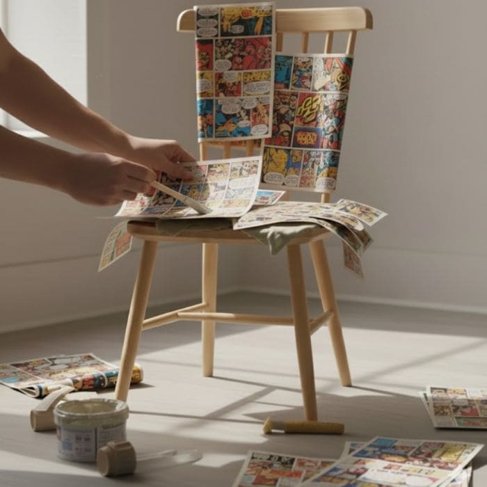 Without fully planning it, I looked up and noticed the old wooden chair near my desk, functional but tired, its surface already worn enough that failure would not feel tragic, and I wondered what would happen if those comic pages stopped being something I stored and became something I lived with.