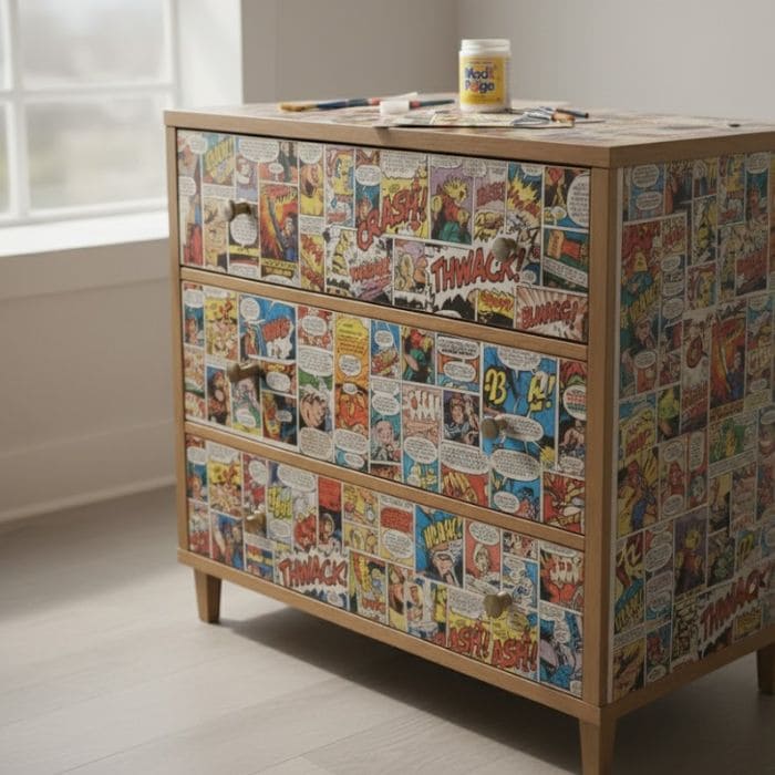 For the dresser, I used between 110 and 130 comic pages, depending on drawer size, and this time I laid everything out on the floor first, arranging pages to see how colors flowed across the entire piece, making sure one drawer did not visually dominate the others.