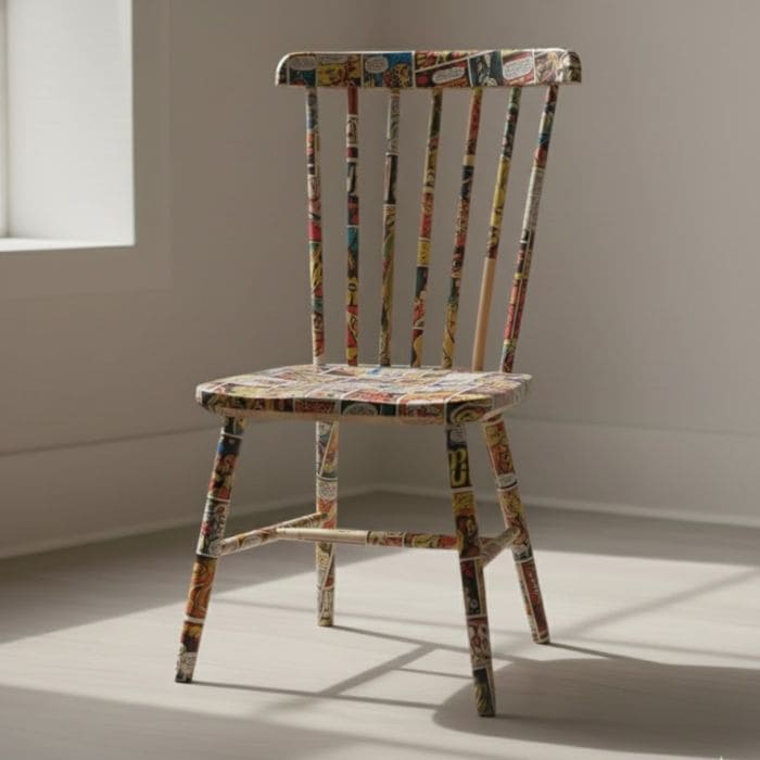 For the chair seat, I used around 30 comic pages, overlapping them slightly to avoid visible gaps, while the backrest took another 20 pages, trimmed carefully to follow the curve of the wood.
