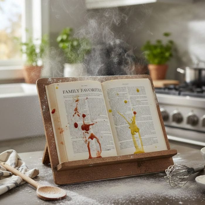 My cookbook stays open. My recipe printouts stop curling and sliding. I can cook with both hands and keep my attention where it belongs, on the food, not on a screen falling over near a pan.
