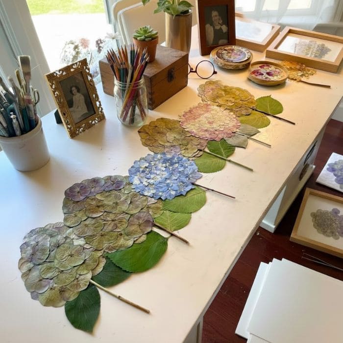 From there, I checked every four to five days, and the entire process took about two weeks before the hydrangea sections felt fully dry, light, and stable, the way pressed flowers should feel when they’re ready to be handled.