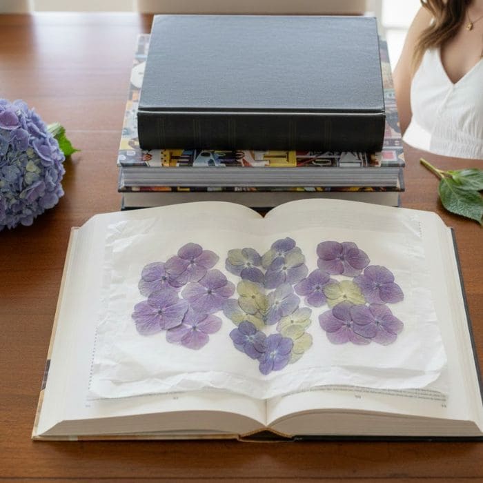 I laid out plain absorbent paper first, then added a layer of parchment paper as a barrier, because hydrangeas can leave moisture marks and I didn’t want to ruin the pages of my books.