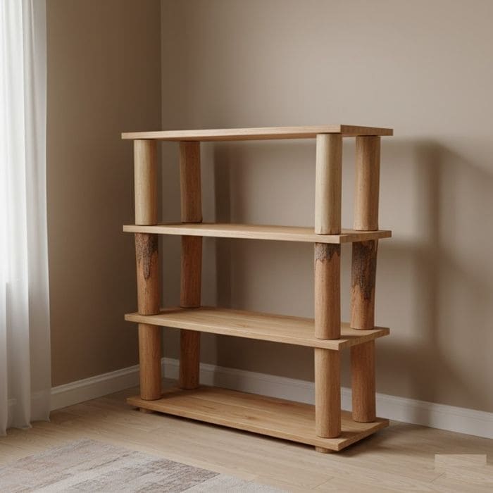 I moved them again and again until the whole structure felt steady. One log leaned slightly inward. Instead of correcting it, I kept it. That small lean made the shelf feel grounded, not stiff.
