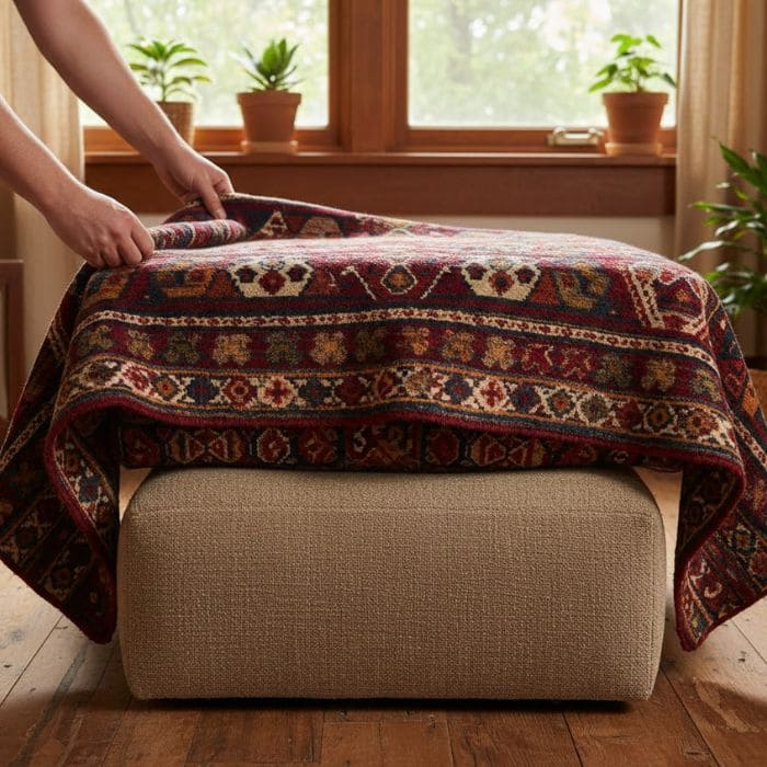 Some people prefer tucking the rug underneath the ottoman if the base allows it. That works too, but only if the ottoman design supports it. In my case, a few hidden tape points were enough.